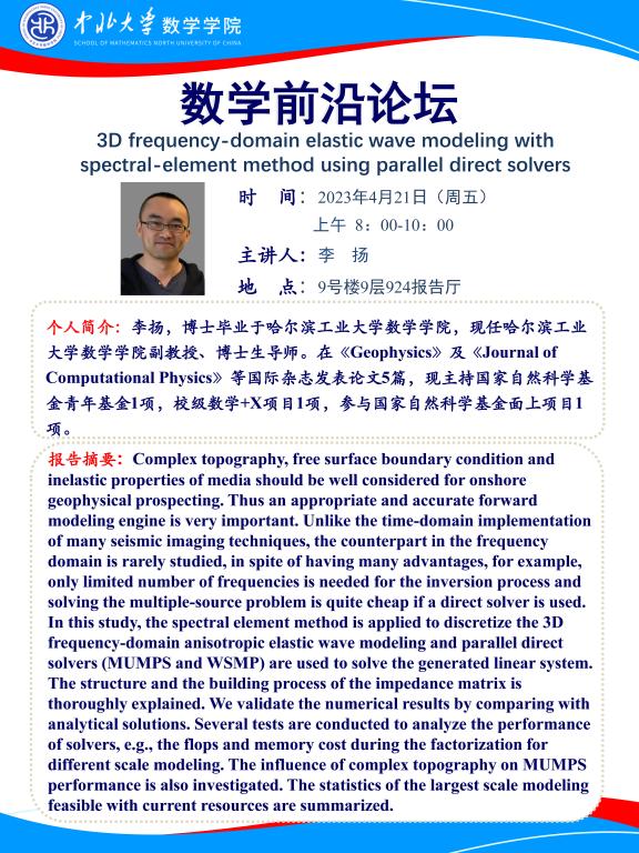 数学前沿论坛第19期 题目:3D frequency-domain elastic wave modeling with spectral-element method using parallel direct solvers