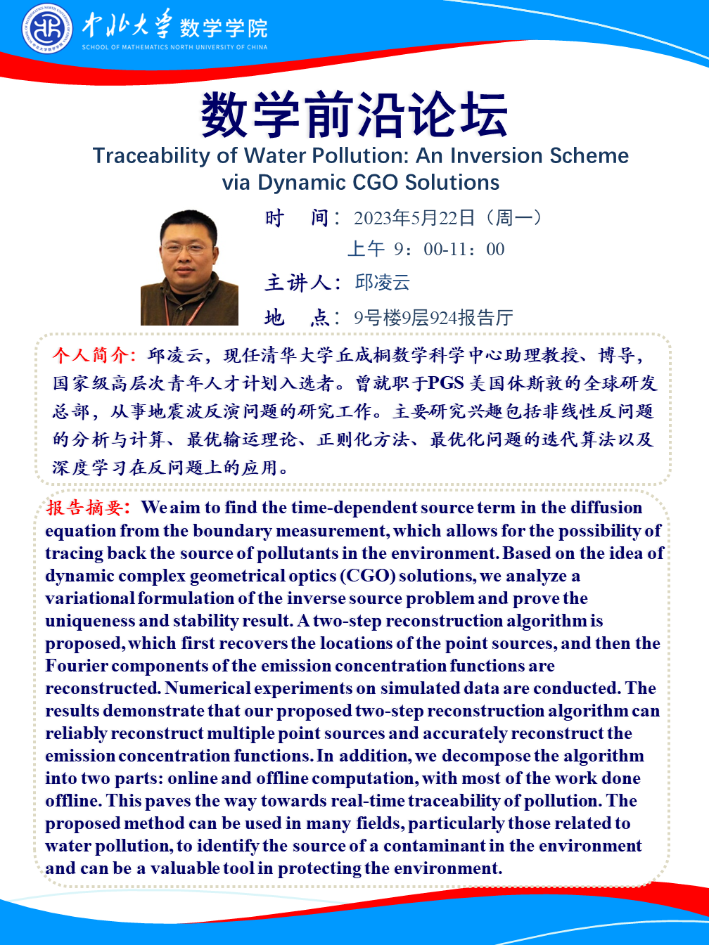 数学前沿论坛第23期 题目:Traceability of Water Pollution: An Inversion Scheme via Dynamic CGO Solutions