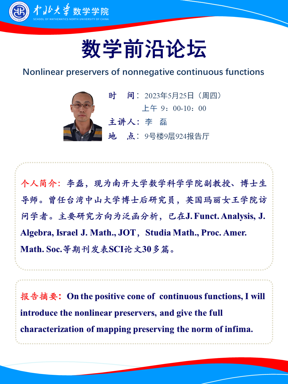 数学前沿论坛第26期 题目:Nonlinear preservers of nonnegative continuous functions
