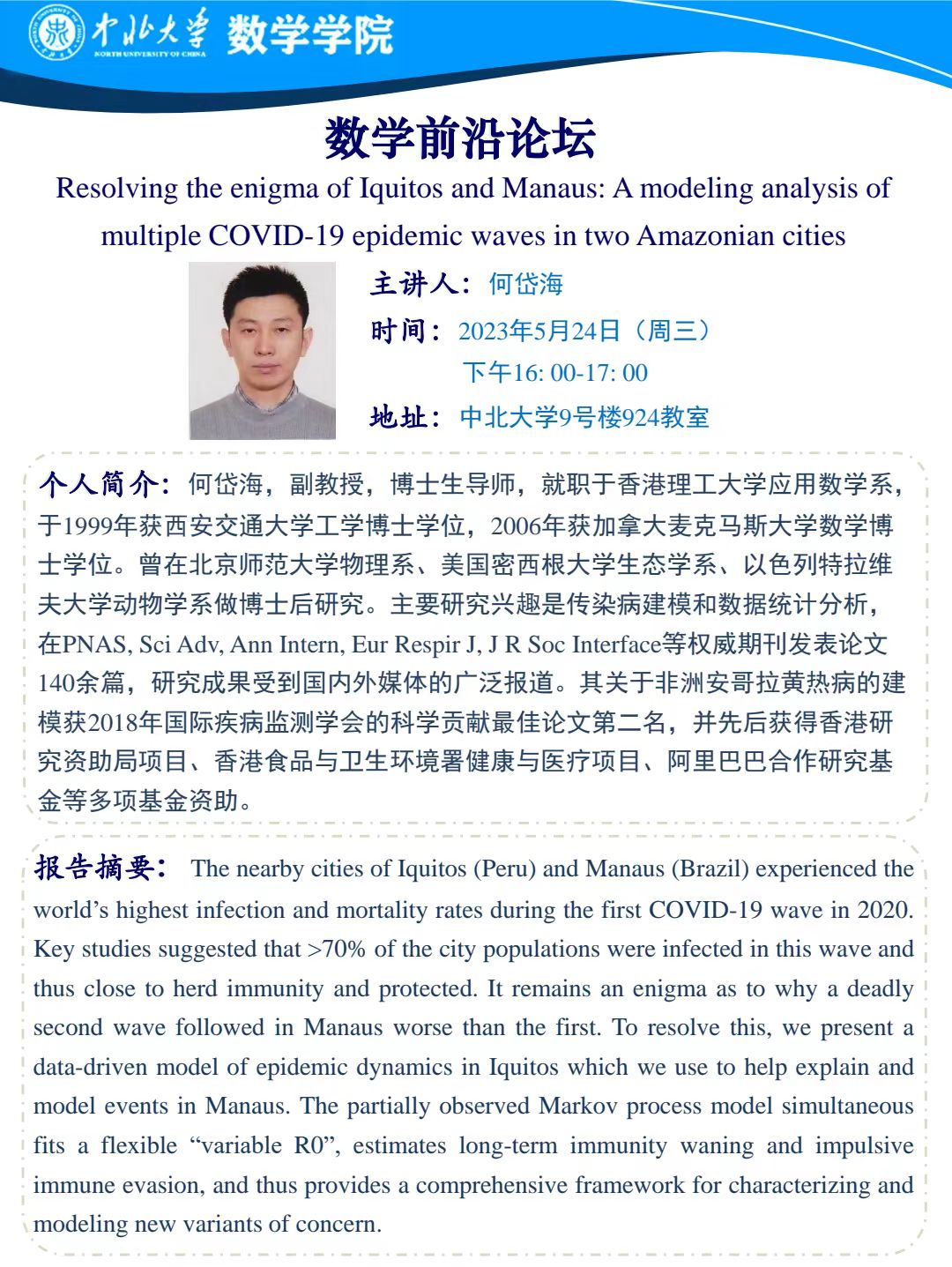 数学前沿论坛第24期 题目:Resolving the enigma of Iquitos and Manaus: A modeling analysis of multiple COVID-19 epidemic waves in two Amazonian cities