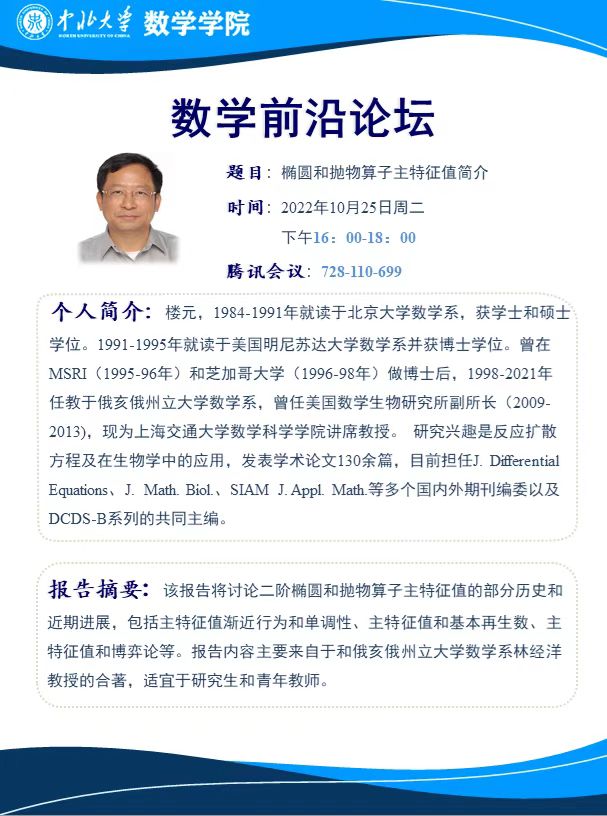 数学前沿论坛第2期 题目:椭圆和抛物算子主特征值简介
