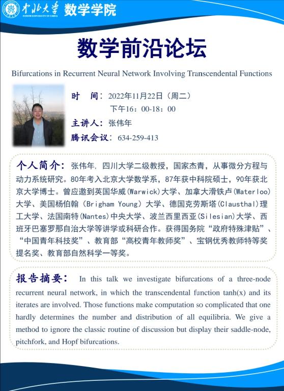 数学前沿论坛第6期 题目:Bifurcations in Recurrent Neural Network Involving Transcendental Functions