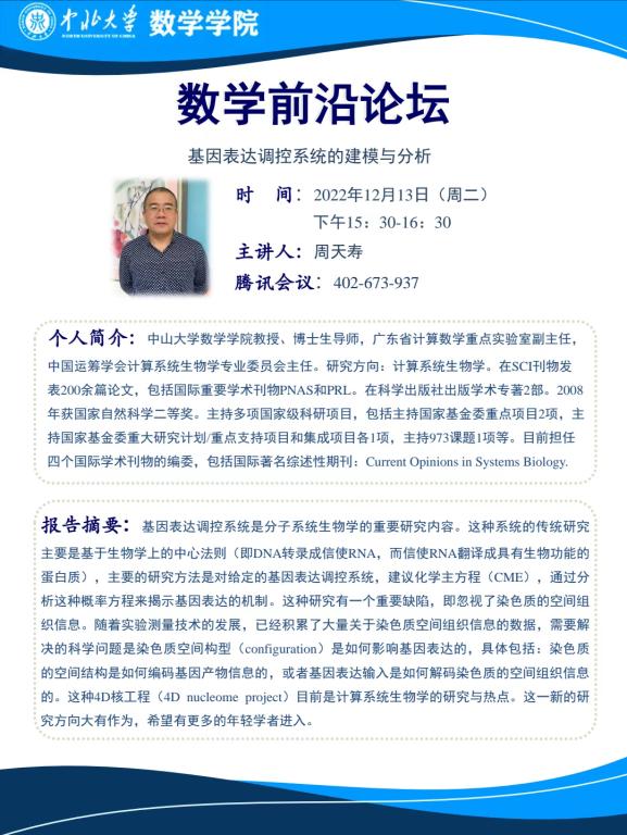 数学前沿论坛第11期 题目:基因表达调控系统的建模与分析
