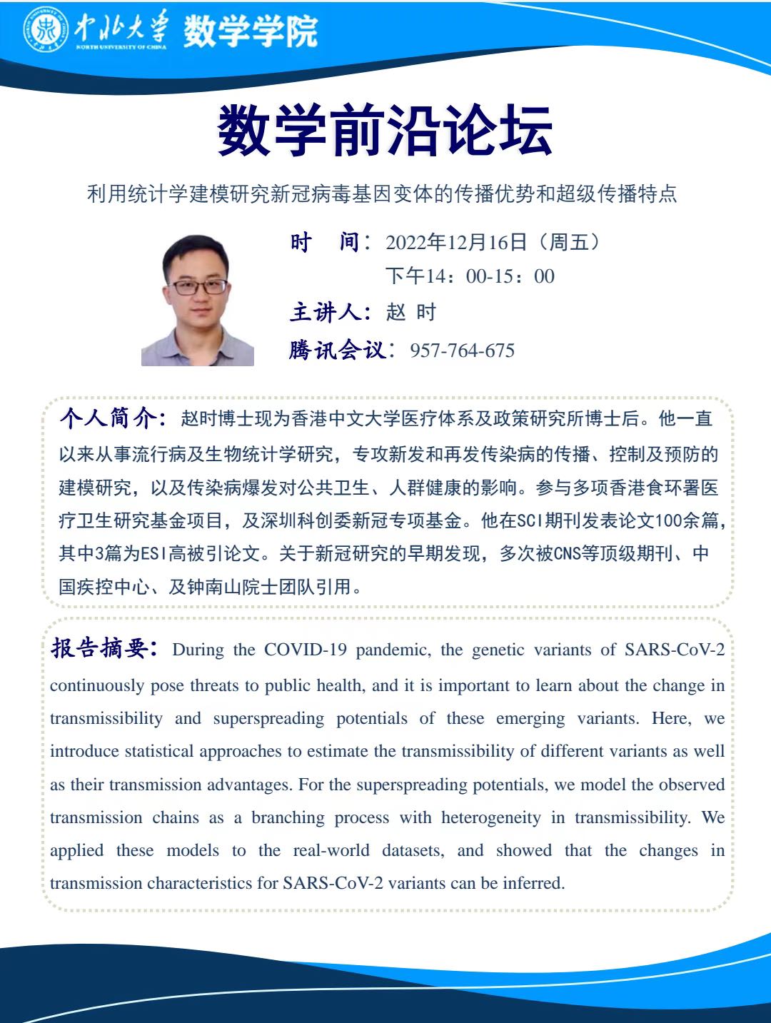 数学前沿论坛第12期 题目:利用统计学建模研究新冠病毒基因变体的传播优势和超级传播特点