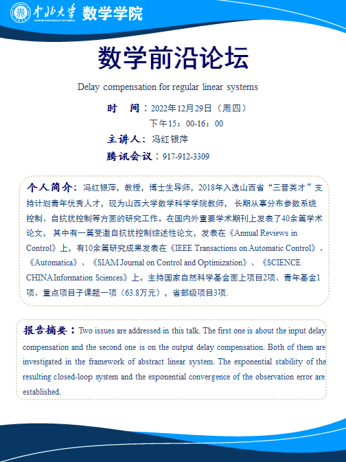 数学前沿论坛第15期 题目:Delay compensation for regular linear systems