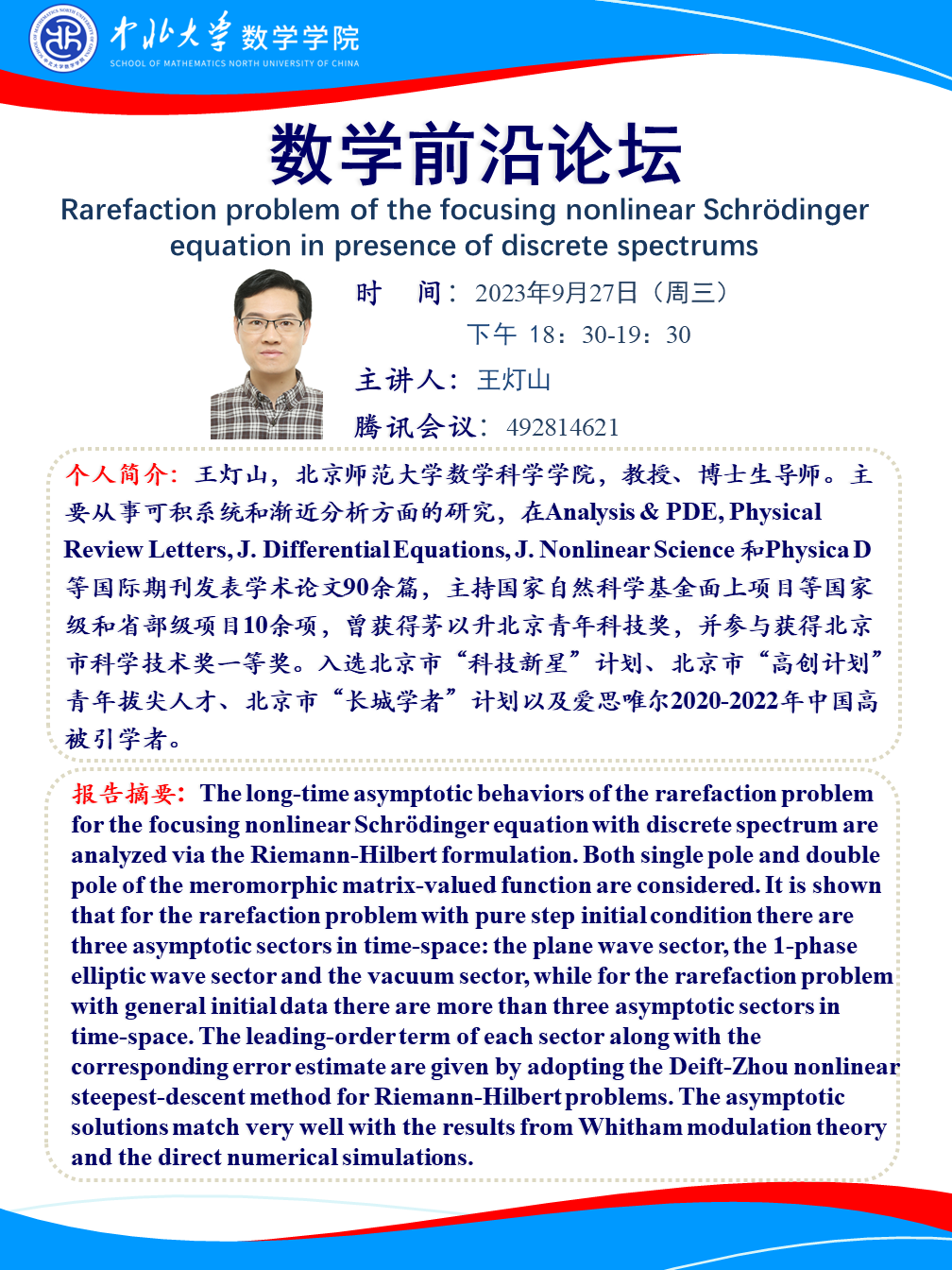 数学前沿论坛第35期 题目:Rarefaction problem of the focusing nonlinear Schrödinger equation in presence of discrete spectrums