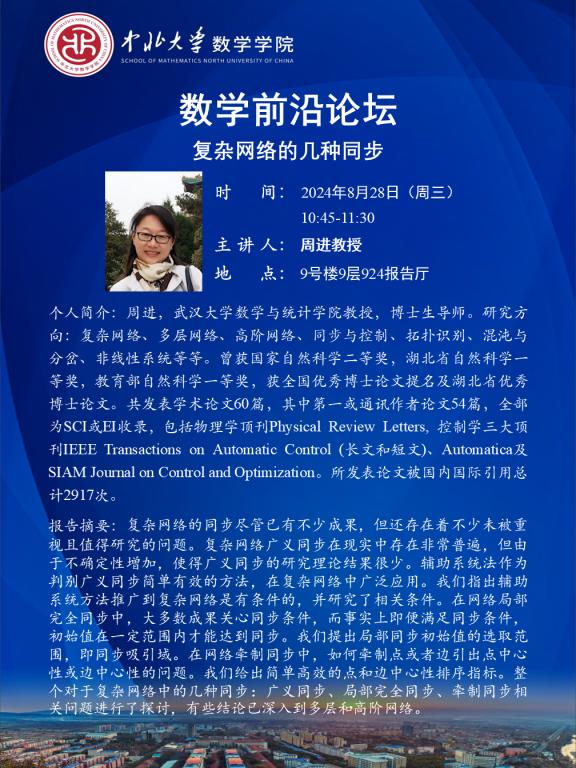 数学前沿论坛第76期 题目:复杂网络的几种同步