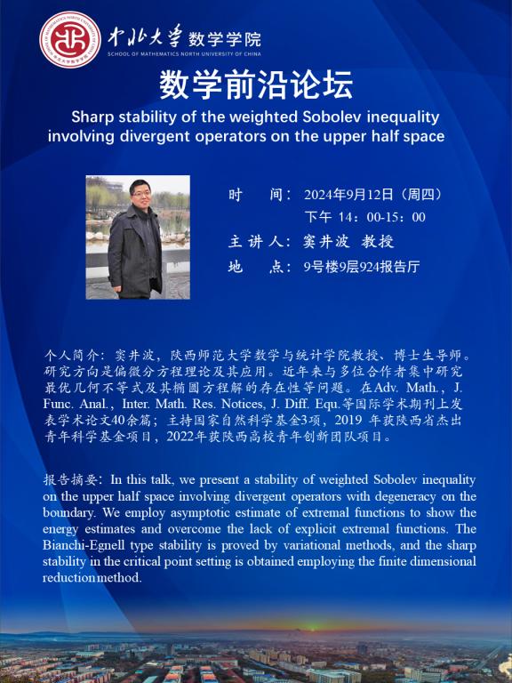 数学前沿论坛第77期 题目:Sharp stability of the weighted Sobolev inequality involving divergent operators on the upper half space