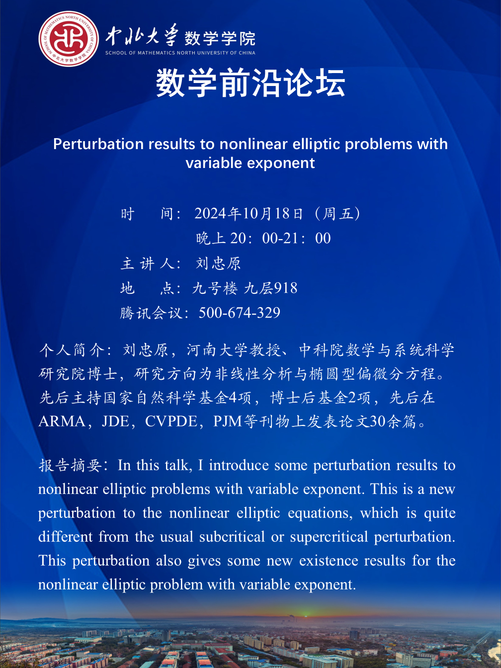 数学前沿论坛第81期 题目:Perturbation results to nonlinear elliptic problems with variable exponent