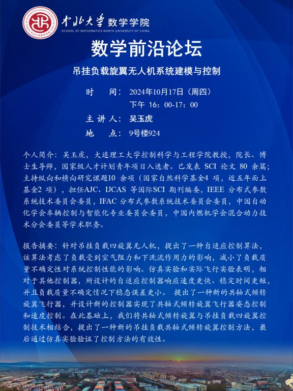 数学前沿论坛第80期 题目:吊挂负载旋翼无人机系统建模与控制