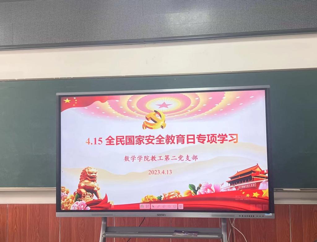 教工第二党支部组织全体党员开展“4·15全民国家安全教育日专项学习”主题党日活动,旨在贯彻总体国家安全观,增强全民国家安全意识和素养,深刻领会国家安全教育的重要意义。活动中,党支部书记及支委委员通过聆听内容讲解、观看视频短片等形式带领全体党员深入学习新时代总体国家安全观的主要内容、范围领域和重要意义。最后,大家就此次专项学习发表自己的看法,共同探讨如何将维护国家安全贯彻落实到实践中去。通过本次专项学习主题党日活动,教工第二党支部全体党员深入了解了相关国家安全知识,深刻认识到国家安全面临的形势,树立了自觉维护国家安全的责任意识,进一步增强了为维护国家安全和社会稳定根基建设贡献力量的使命感。