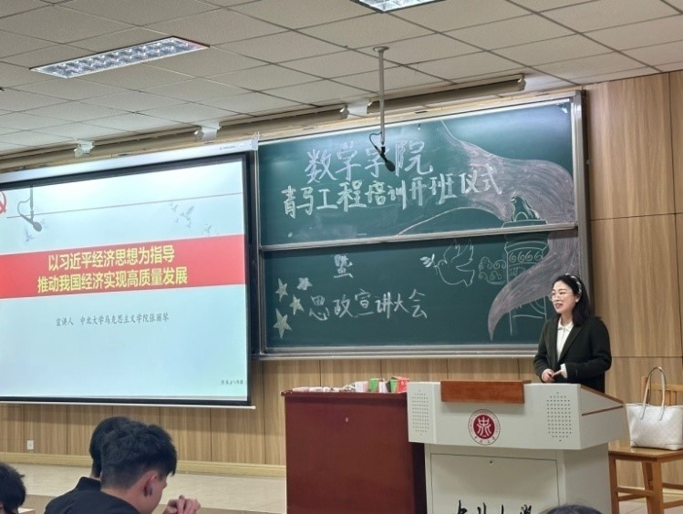 马克思主义学院张丽琴老师来给同学们做“以习近平经济思想为指导,推动我国经济实现高质量发展”的宣讲。宣讲会是一种有效的教育交流方式,旨在传递知识、引导思想、培养人才,它引导同学们思考,启发他们独立思考、形成独立见解的能力。