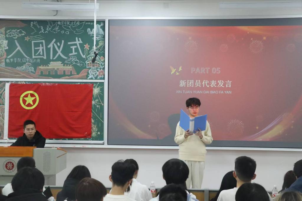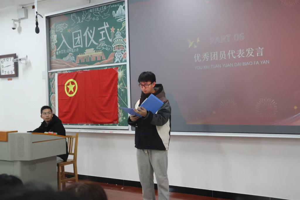 活动第六项,优秀团员代表贾申同学分享了自己在团组织中的成长经历与感悟,他讲述了自己在实践中收获成长,鼓励新团员们珍惜青春时光,勇于担当,积极参与社会实践和志愿服务活动,在共青团的大舞台上绽放绚丽光彩。