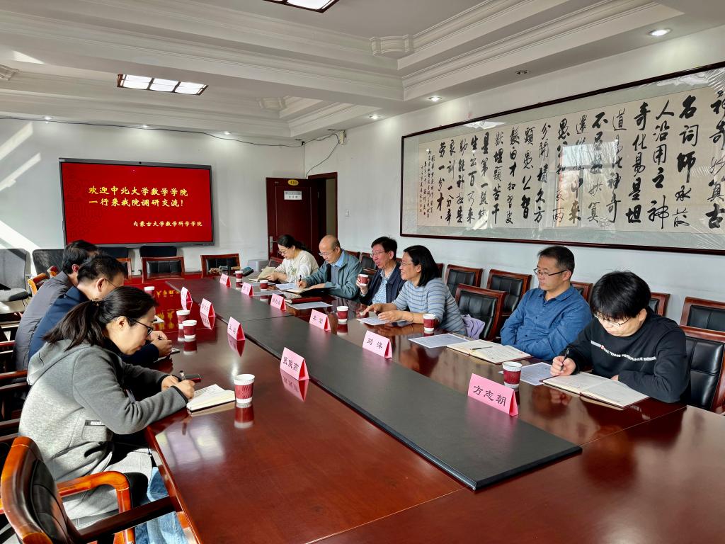 上午,调研人员首先与内蒙古大学数学科学学院党委书记胡利春、院长李宏、副院长贺飞、刘洋等进行了座谈。座谈会上,双方就数学与统计专业的课程设置、学科建设、党建工作、学生教育管理等议题进行了深入的探讨,内蒙古大学数学科学学院在学科建设和教育教学方面的特色做法、本科生培养模式的先进经验等,让调研团队深受启发。