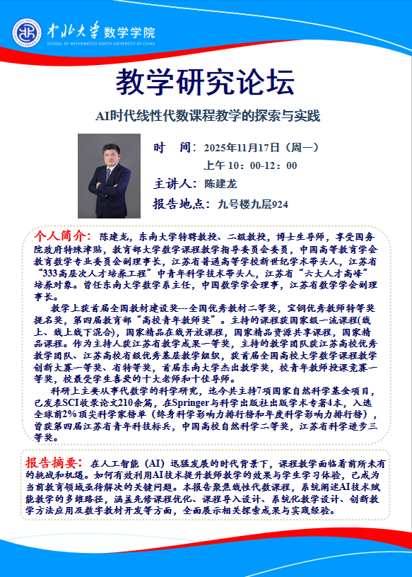 在九号楼924会议室举办专题报告,特邀教育部大学数学课程教学指导委员会委员、东南大学陈建龙教授以“AI时代线性代数课程教学的探索与实践”为题分享经验。偷拍av