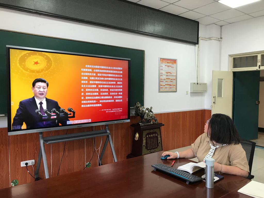 6月8日下午,教工第二党支部全体党员在9号楼6层会议室开展学习贯彻习近平新时代中国特色社会主义思想主题教育第六次专题学习。由冯姗姗同志和乔志琴同志分别就“坚持全面依法治国”和“铸就社会主义文化新辉煌”为主题带领全体党员共同学习。