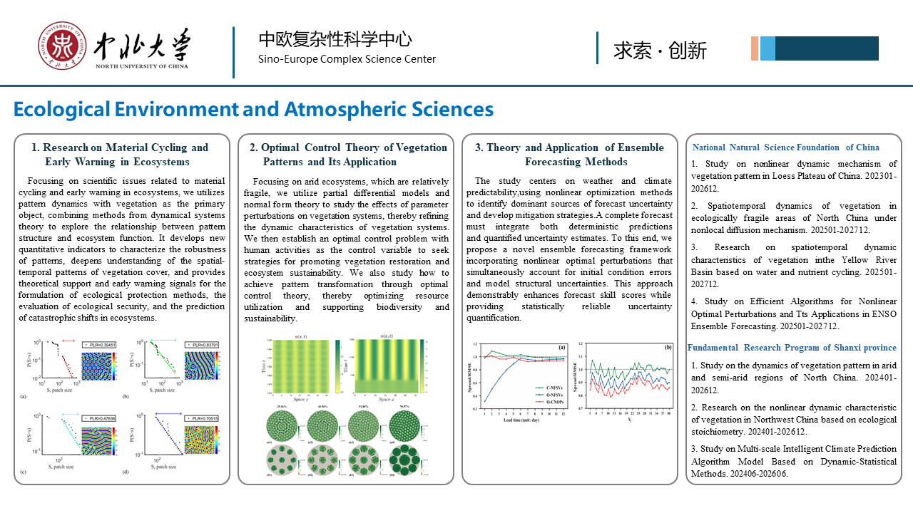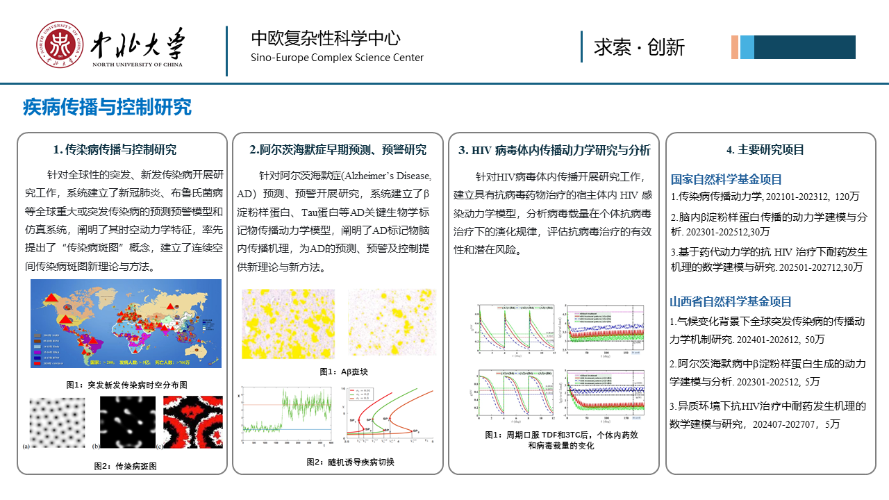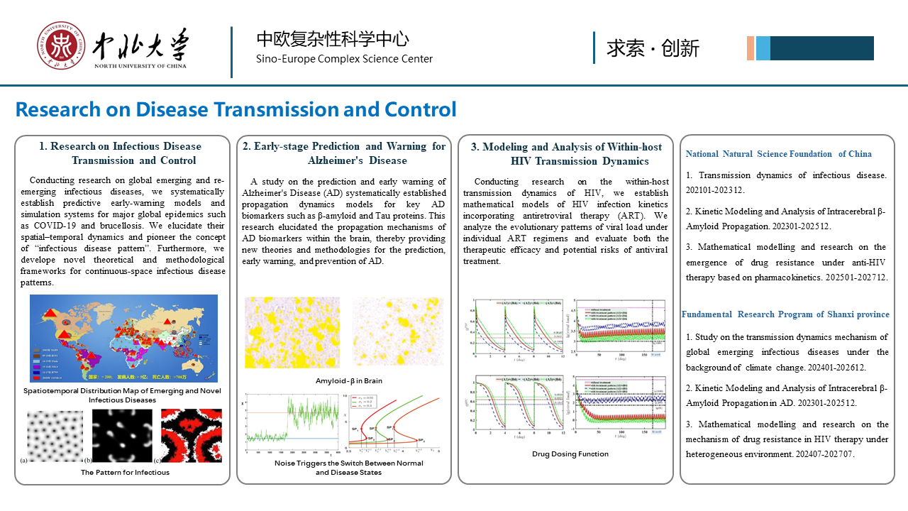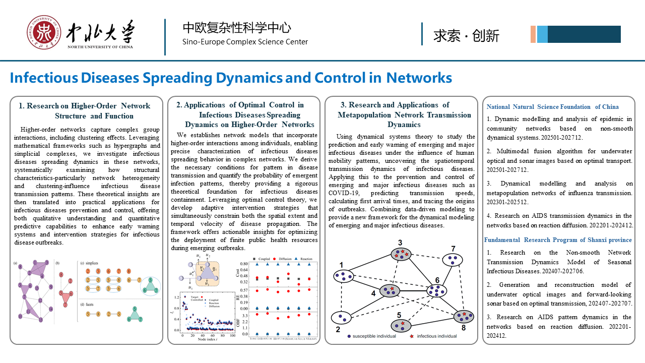 The Sino-European Complexity Science Center at North University of China, established in 2022, conducts fundamental and applied research focusing on the transmission and control for disease, spreading dynamics on networks, as well as ecological environment and atmospheric science. Currently, this center comprises 22 full-time faculty members, including the academician of the european academy of sciences, the national high-level talents, the recipient of special government allowances of the state council, and ESI highly cited researcher.
